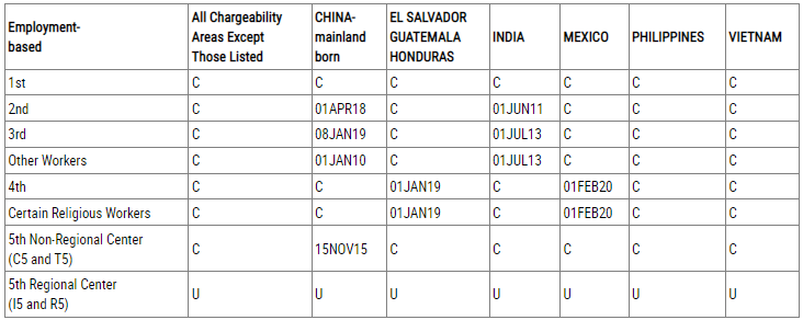 根據(jù)職業(yè)移民簽證排期表A,對(duì)于中國(guó)大陸出生的申請(qǐng)人,EB-1、EB-4類別繼續(xù)維持無(wú)排期狀態(tài);EB-2類別排期為2018年4月1日,前進(jìn)4個(gè)月;EB-3類別排期為2019年1月8日,前進(jìn)7天;EB-5直投類別排期為2015年11月15日,前進(jìn)7天;EB-5區(qū)域中心類別顯示“U”,因法案暫停暫無(wú)簽證名額可用。