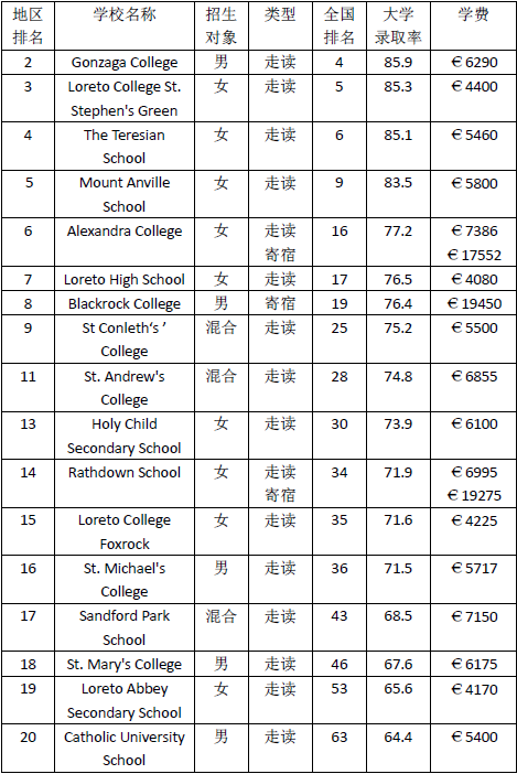 (據2018年Sunday Times愛爾蘭學校排名榜)