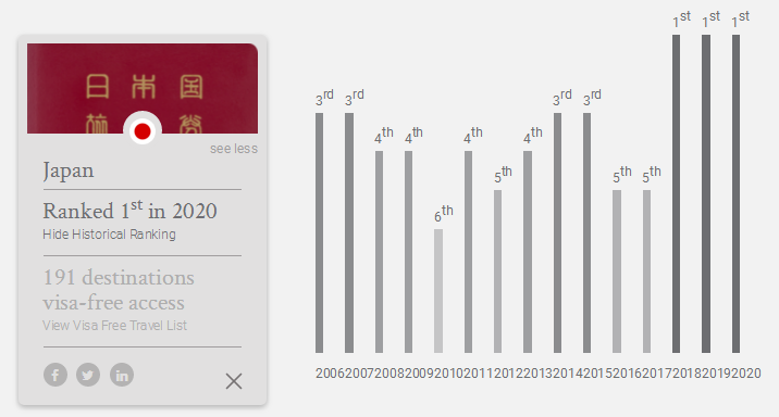 根據這份最新榜單,2020年亞洲、歐洲國家表現強勁,包攬全球暢行榜TOP10,亞洲國家更是霸榜全球TOP3。其中,日本護照第三年蟬聯榜首,免簽/落地簽191個目的地;新加坡護照排第二,可免簽/落地簽190個目的地;韓國和德國護照并列第三,能免簽/落地簽189個目的地。