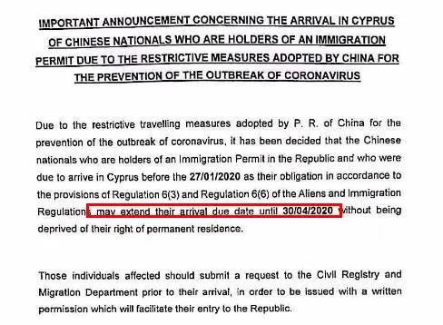 疫情發(fā)生后,很多塞浦路斯的永久居民不能如期進(jìn)行兩年一次的登陸,經(jīng)中國駐塞浦路斯使館的多次協(xié)調(diào),塞浦路斯移民局出臺如下延期登陸解釋:
