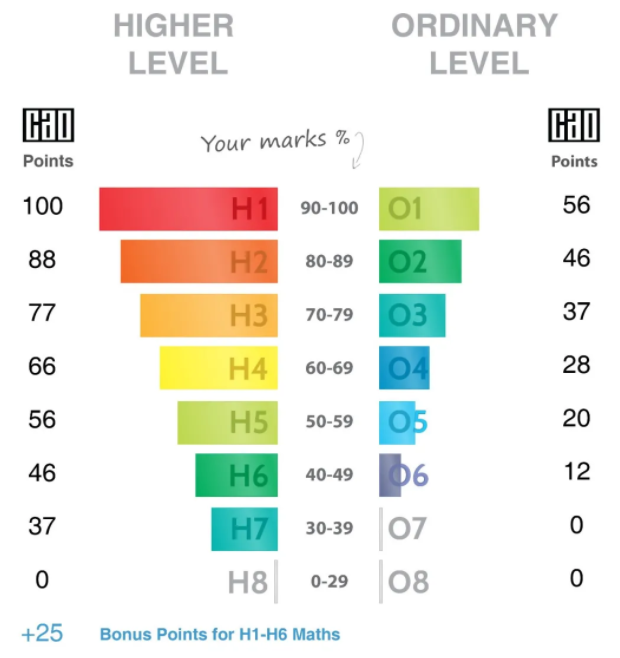 愛爾蘭高考滿分為625分(六門課單科成績?yōu)闈M分100分,其中數(shù)學只要及格就獲得25分附加分)。學生的百分制分數(shù)會轉(zhuǎn)換成相應(yīng)的1-8等級計分方式,包括“高級水平(H)”和“普通水平(O)”(考生可以根據(jù)自身情況選擇考試等級),每個等級會獲得不同的CAO點數(shù),這些點數(shù)疊加用來申請理想的學校和專業(yè)。
