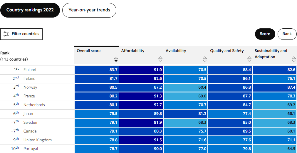 近日,《經濟學人》發布了《2022全球食品安全指數》(Global Food Security Index,簡稱GFSI)排名,愛爾蘭以81.7的綜合分數在全球113個評估國家中排名第二!芬蘭以83.7分由去年的全球第四上升到全球第一。中國以74.2分排名全球第25位。