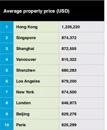 據(jù)報告顯示,全球房價最高的三個城市均位于亞洲。香港以套均123.5萬美元的成交均價蟬聯(lián)全球房價最高城市榜首,其次是新加坡的87.4萬美元,上海和溫哥華緊隨其后。排在前十名的美國城市有洛杉磯和紐約。深圳和北京分別排名第五和第九位。