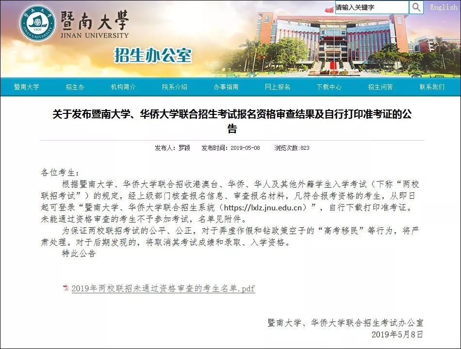 5月8日,暨南大學招生辦公室網站上發布公告,稱根據暨南大學、華僑大學聯合招收港澳臺、華僑、華人及其他外籍學生入學考試(下稱“兩校聯招考試”)的規定,經上級部門核查報名信息、審查報名材料,未能通過資格審查的考生將不予參加考試。
