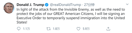 特朗普在推特上寫道,“鑒于‘這個看不見的敵人’(指新冠病毒)的攻擊,以及保護(hù)我們偉大的美國公民的工作需要,我將簽署一項行政命令,暫停移民入境美國!”
