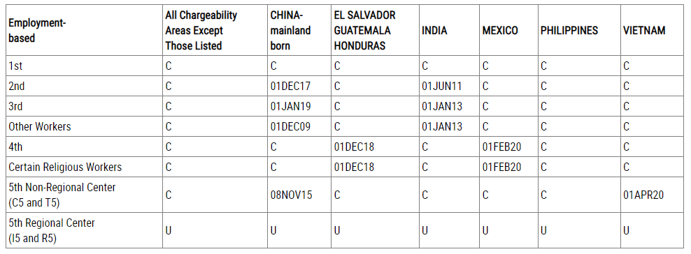 職業移民表A:EB-2前進7個月,EB-3前進4個月,EW-3(Other Workers,非技術移民)前進2個月,EB-5非區域中心前進54天。