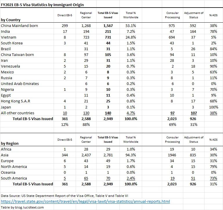 ①2021財(cái)年,全年共發(fā)放2949張EB-5簽證,其中926張來自于移民局,2023張來自于各國使領(lǐng)館;