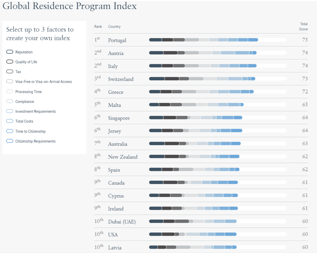 Henley & Partners全球居留計劃指數全面分析和評估了全球25個最為重要的居留計劃,反映了全球居留計劃中最具聲譽項目的相對價值。該指數每年在《投資移民項目報告》中發布,每年由頂尖學術研究人員、國家風險專家、經濟學家、獨立的移民專家和公民身份律師以及其他行業專家進行修訂。