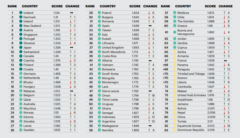 冰島在今年的排名中再次穩居全世界最和平國家,自2008年起冰島一直位居首位。其后依次是丹麥、愛爾蘭、新西蘭和奧利地。阿富汗連續第八年被評為世界上最不和平的國家。歐洲被評為全球最和平的地區,前10名最和平國家中的7個在歐洲。