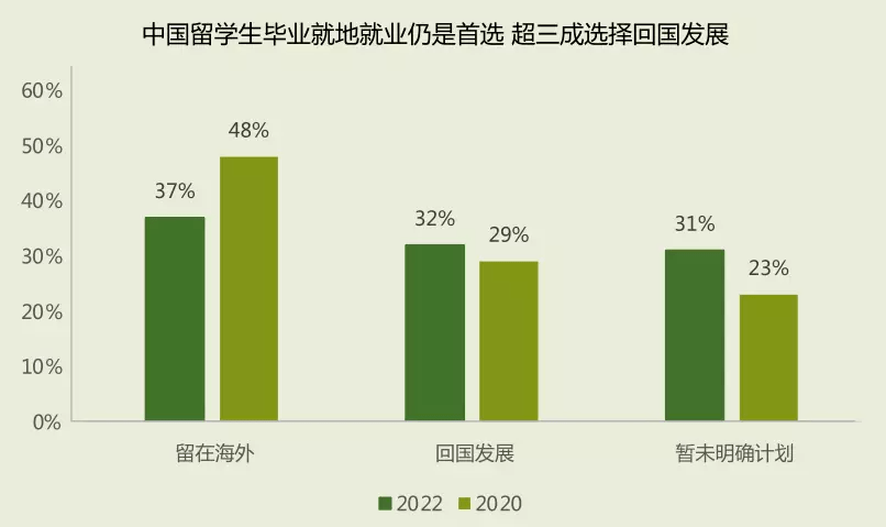 據領英發布的《2022中國留學生歸國求職洞察報告》,2022年,有37%的學生希望畢業后能留在海外發展(2020年這一占比達48%),32%選擇畢業后回國就業,還有31%選擇觀望。