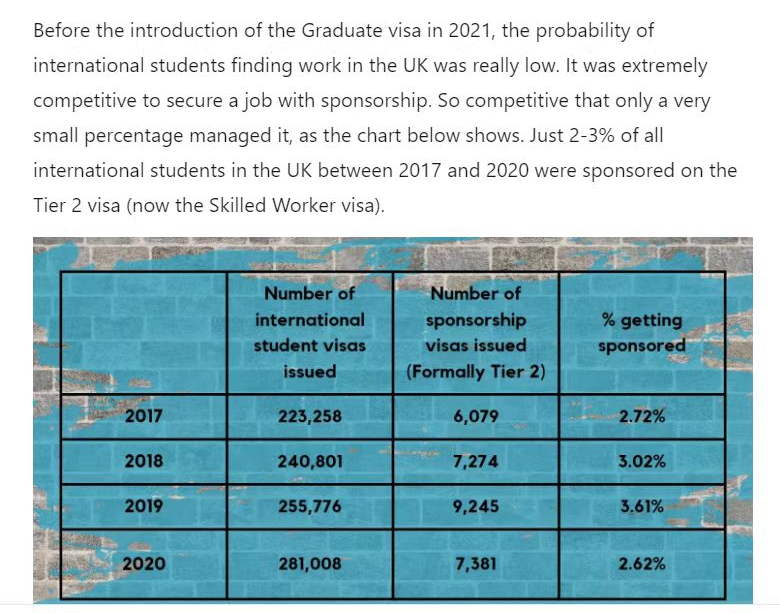 去年底,Ivy就和家人開始研究起畢業后如何留在英國,雖然可以申請PSW畢業生兩年留英簽,但眼看著極低的轉工簽率,她對此并不抱希望,且PSW簽證不計入轉永居時長。